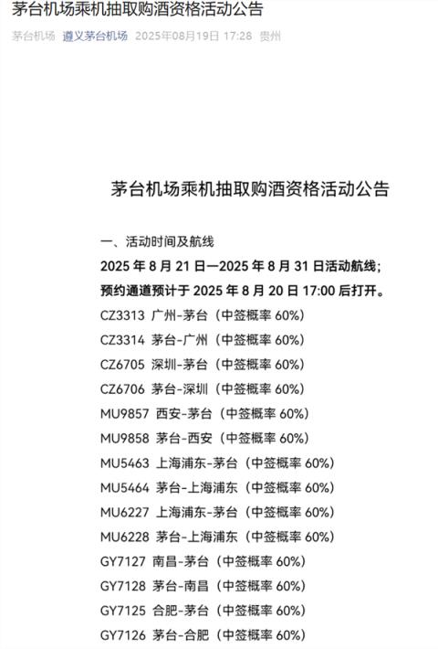 8月19日消息,今日,遵義茅臺(tái)機(jī)場官方公眾號(hào)發(fā)布“茅臺(tái)機(jī)場乘機(jī)抽取購酒資格活動(dòng)公告”稱,茅臺(tái)機(jī)場將于8月21日- 8月31日,開展乘機(jī)抽取購酒資格活動(dòng),涉及廣州、深圳、西安、南昌、合肥、南京等往返茅臺(tái)等活動(dòng)航線,預(yù)約通道8月20日17:00后開啟,各航線中簽概率均為60% 。