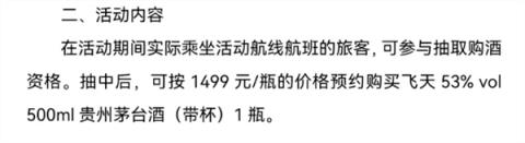 在活動(dòng)期間實(shí)際乘坐活動(dòng)航線航班的旅客,可參與抽取購酒資格。抽中后,可按1499元/瓶的價(jià)格預(yù)約購買飛天53%vo500ml貴州茅臺(tái)酒(帶杯)1瓶。