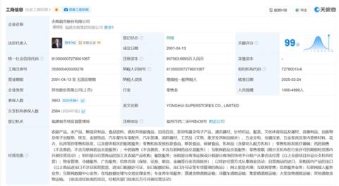 天眼查顯示,永輝超市股份有限公司成立于2001年,位于福建省福州市,是一家以從事零售業(yè)為主的企業(yè),企業(yè)注冊資本907503.6993萬人民幣。