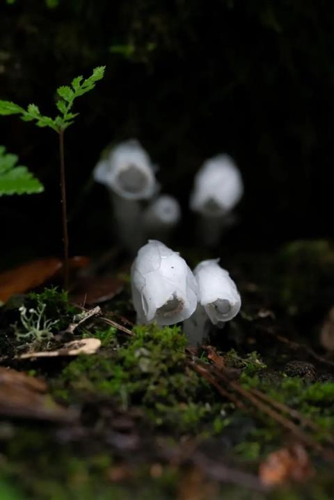 所以,水晶蘭更喜歡出現(xiàn)在樹(shù)林中,還往往從樹(shù)底下冒出來(lái)。
