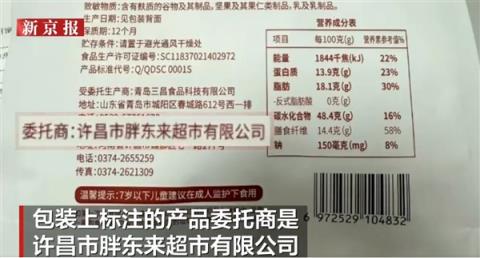 據(jù)報道,該網(wǎng)友所購的一款燕麥脆包裝上印有“胖東來超市”“東來品質(zhì)”字樣,且標(biāo)注的產(chǎn)品委托商為許昌市胖東來超市有限公司。
