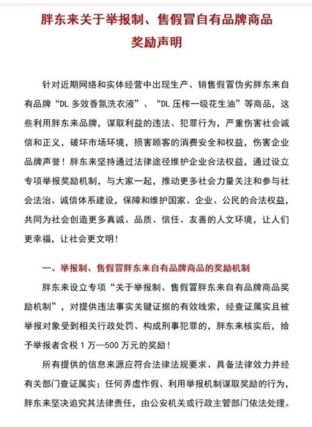 值得一提的是,就在今日,胖東來發(fā)布了關(guān)于舉報制、售假冒自有品牌商品獎勵聲明。