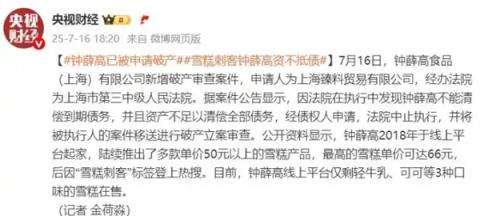 另據(jù)央視財經(jīng)7月16日消息:鐘薛高食品(上海)有限公司新增破產(chǎn)審查案件,申請人為上海臻料貿(mào)易有限公司,經(jīng)辦法院為上海市第三中級人民法院。