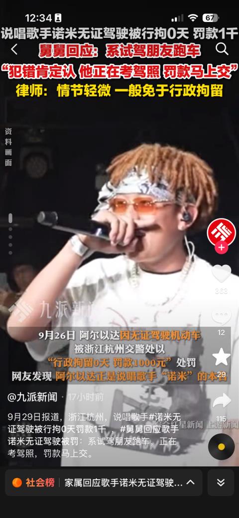 9月30日消息,今日,說唱歌手諾米在社交平臺公開道歉,此前自己因無證駕駛被罰的事件。