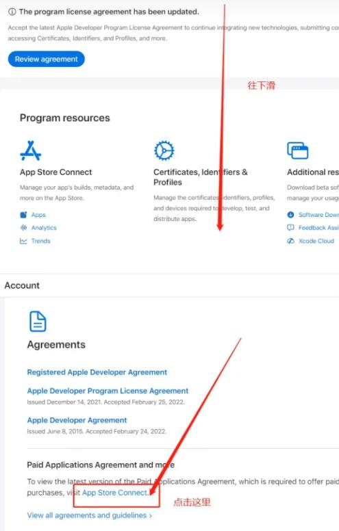 2、頁面往下滑,去到【agreements】的 App Store Connect,點擊進去