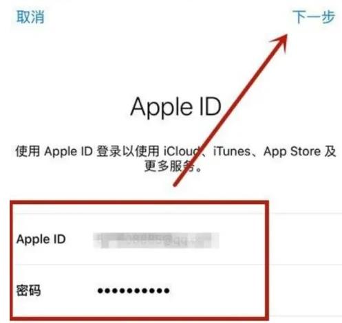 5、如圖所示,接著輸入apple id和密碼并點擊下一步