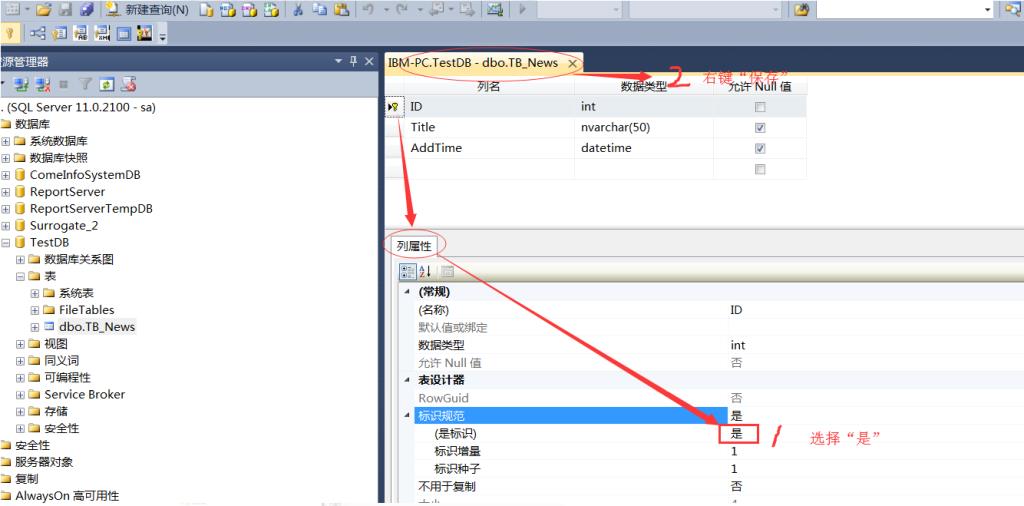 3、在第1步打開的表結(jié)構(gòu)設(shè)置界面,點(diǎn)擊你的列“ID”,在底下的列屬性設(shè)置界面做如下設(shè)置