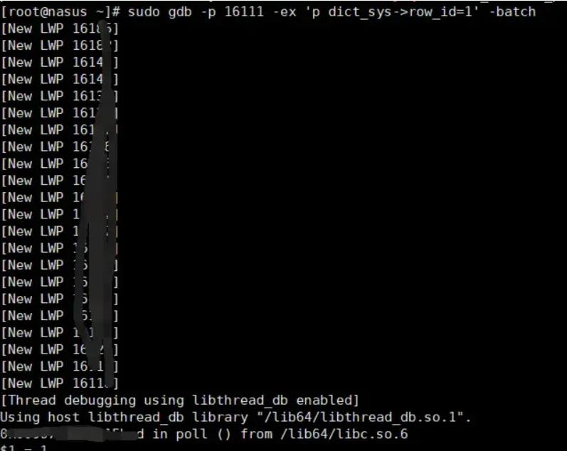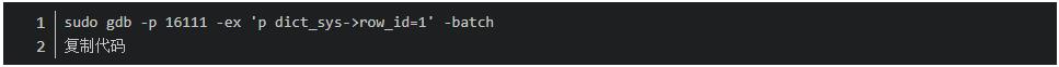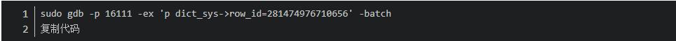 2、通過 ps -ef|grep mysql 命令獲取 mysql 的進(jìn)程 ID,然后執(zhí)行命令,通過 gdb 先把 row_id 修改為 1。PS:沒有 gdb 的,百度安裝下