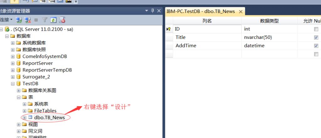 2、打開sqlserver management studio,右鍵點(diǎn)擊你的新聞表,選擇“設(shè)計(jì)”